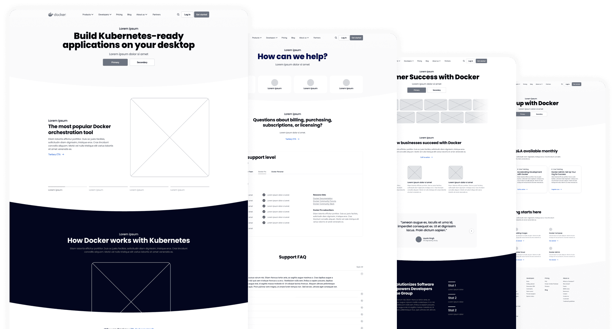 Wireframes were created to agree upon a general direction to fix the website's structure. Webpage templates were then established and foundational components, style guides, and modules were created and implemented to revamp Docker.com.