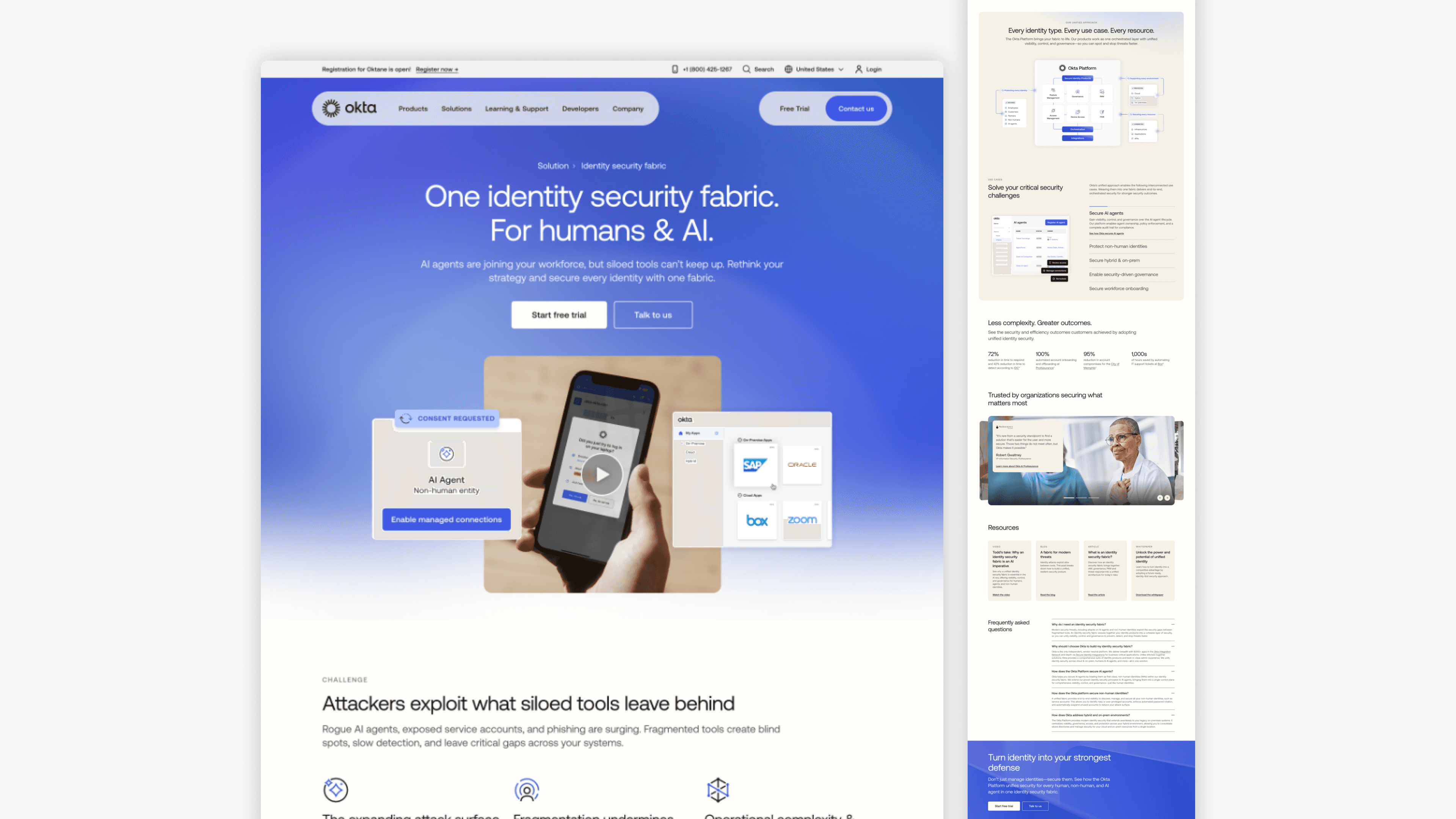 I led and executed page redesigns, new user journeys, and design systems to successfully migrate from Drupal to AEM, implement a GTM pivot to own both workforce and now customer identity solutions, and establish our position on securing AI and non-human identities.